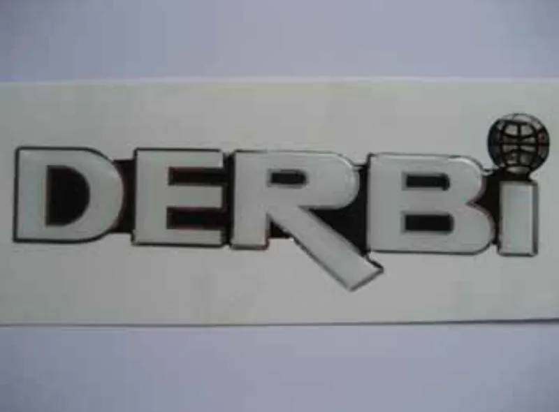 Anagrama (letras blancas sobre fondo negro) en resina flexible (el originsl era en plástico duro) para laterales depósito gasolina en diversos ciclomotores DERBI. El precio aquí indicado es por la unidad.