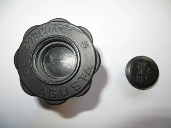 Tapón para depósito gasolina (con cuello roscado) de las motocicletas MV Austa fabricadas en España. El conjunto tapón incluye roscado el taponcito con San Cristóbal (que no está pintado de color plata).